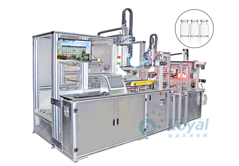 西林瓶生產(chǎn)線包括:自動(dòng)上管、自動(dòng)成型、經(jīng)機(jī)械手轉(zhuǎn)換至前端檢測(cè)線(也叫生產(chǎn)管控)、檢測(cè)線檢測(cè)的項(xiàng)目:1、瓶口內(nèi)外徑 2、瓶身長(zhǎng)短 3、瓶身外徑 4、瓶口邊厚 5、瓶底內(nèi)凹尺寸檢測(cè);經(jīng)檢測(cè)后的合格品再用機(jī)械手夾盤(pán)轉(zhuǎn)換至退火爐網(wǎng)帶上,經(jīng)高溫減除應(yīng)力后再降溫,通過(guò)氣動(dòng)吸盤(pán)將回火后的小瓶轉(zhuǎn)換至后端檢測(cè)線,后端檢測(cè)(也是重檢也叫終檢),經(jīng)后端拍照檢測(cè)項(xiàng)目